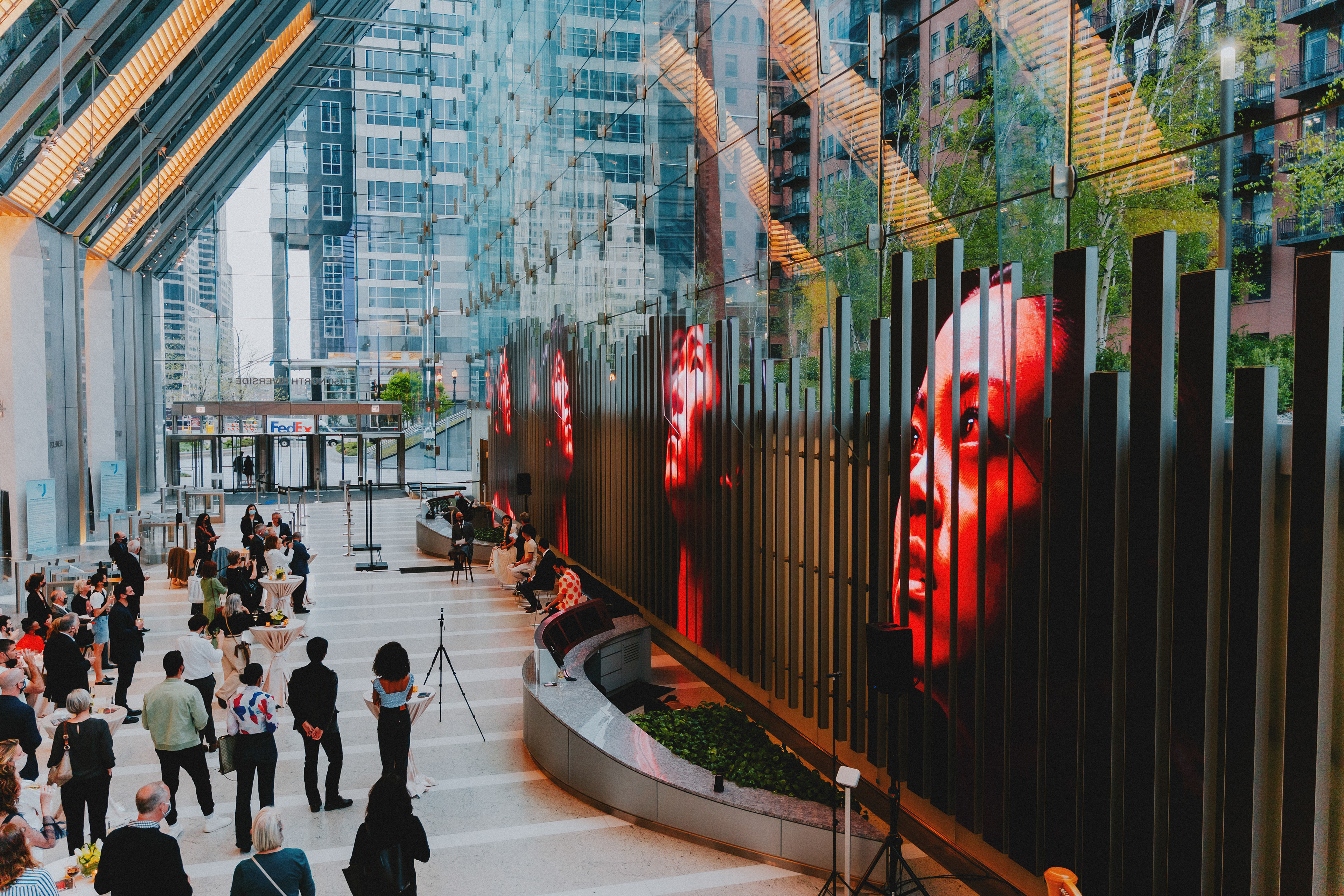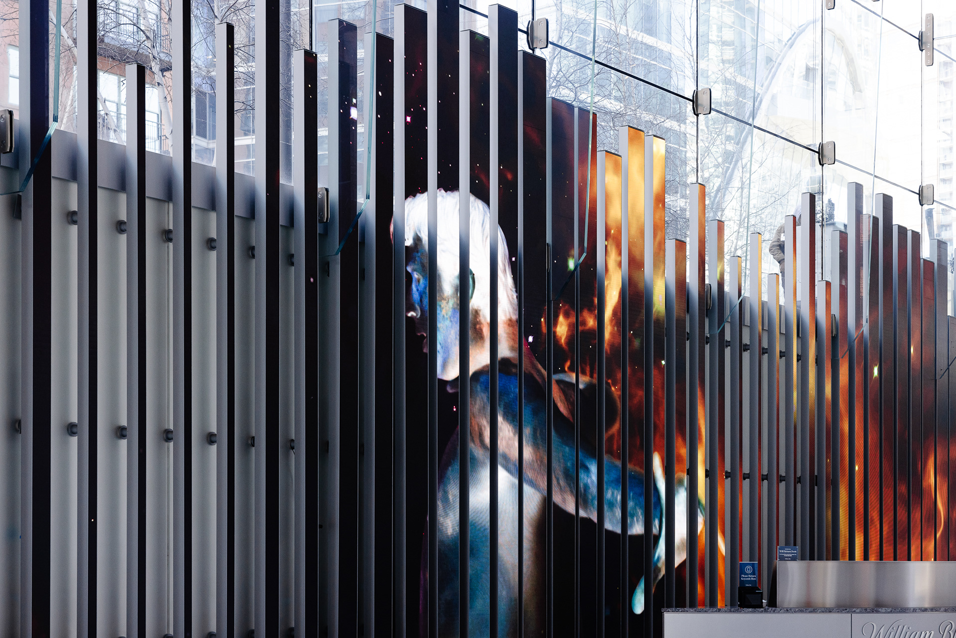 "Camellia" displayed on the obelisk on State Street outside of ABC7 News.
